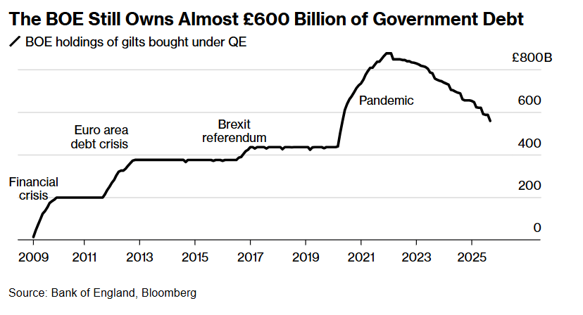 最新的统计数据显示,即使经历一段时间QT之后,英国央行仍持有近6000亿英镑的英国政府债券。